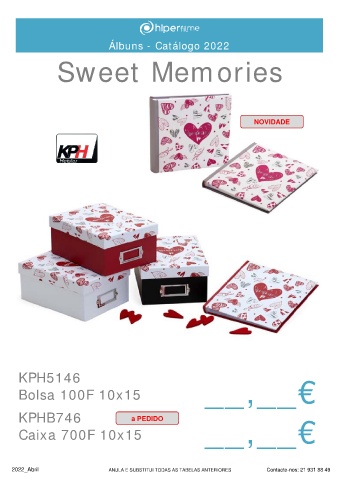 Álbuns - Catálogo 2022 Sweet Memories NOVIDADE KPH5146 Bolsa 100F 10x15 __,__€ KPHB746 a PEDIDO Caixa 700F 10x15 __,__€ 2022_Abril ANULA E SUBSTITUI TODAS AS TABELAS ANTERIORES Contacte-nos: 21 931 88 49