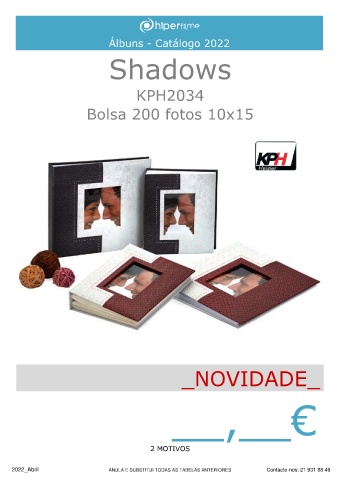 Álbuns - Catálogo 2022 Shadows KPH2034 Bolsa 200 fotos 10x15 _NOVIDADE_ __,__€ 2 MOTIVOS 2022_Abril ANULA E SUBSTITUI TODAS AS TABELAS ANTERIORES Contacte-nos: 21 931 88 49