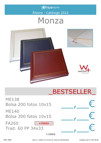 Álbuns - Catálogo 2022 Monza _BESTSELLER_ ME138 Bolsa 200 fotos 10x15 __,__€ ME140 Bolsa 300 fotos 10x15 __,__€ FA260 A PEDIDO Trad. 60 PP 34x33 __,__€ 3 CORES 2022_Abril ANULA E SUBSTITUI TODAS AS TABELAS ANTERIORES Contacte-nos: 21 931 88 49