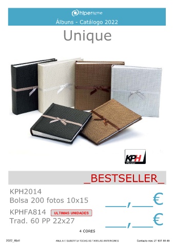 Álbuns - Catálogo 2022 Unique _BESTSELLER_ KPH2014 Bolsa 200 fotos 10x15 __,__€ KPHFA814 ULTIMAS UNIDADES Trad. 60 PP 22x27 __,__€ 4 CORES 2022_Abril ANULA E SUBSTITUI TODAS AS TABELAS ANTERIORES Contacte-nos: 21 931 88 49
