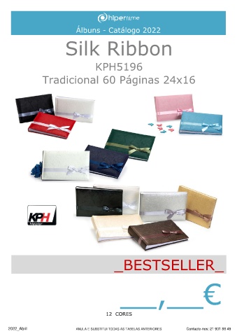 Álbuns - Catálogo 2022 Silk Ribbon KPH5196 Tradicional 60 Páginas 24x16 _BESTSELLER_ __,__€ 12 CORES 2022_Abril ANULA E SUBSTITUI TODAS AS TABELAS ANTERIORES Contacte-nos: 21 931 88 49
