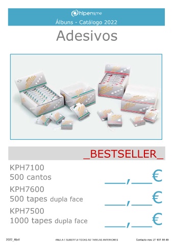 Álbuns - Catálogo 2022 Adesivos _BESTSELLER_ KPH7100 500 cantos __,__€ KPH7600 500 tapes dupla face __,__€ KPH7500 1000 tapes dupla face __,__€ 2022_Abril ANULA E SUBSTITUI TODAS AS TABELAS ANTERIORES Contacte-nos: 21 931 88 49