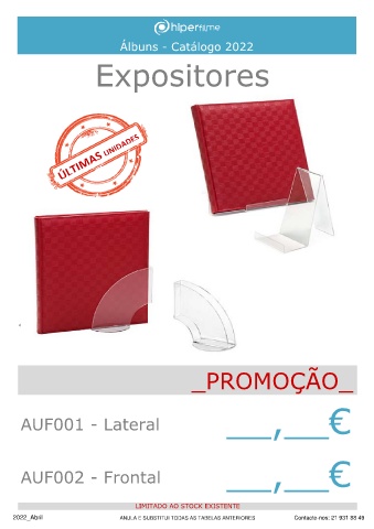 Álbuns - Catálogo 2022 Expositores compl _PROMOÇÃO_ __,__€ AUF001 - Lateral __,__€ AUF002 - Frontal LIMITADO AO STOCK EXISTENTE 2022_Abril ANULA E SUBSTITUI TODAS AS TABELAS ANTERIORES Contacte-nos: 21 931 88 49