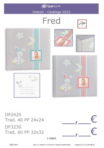 Infantil - Catálogo 2022 Fred DF2420 Trad. 40 PP 24x24 __,__€ DF3230 Trad. 60 PP 32x32 __,__€ 2 CORES 2022_Abril ANULA E SUBSTITUI TODAS AS TABELAS ANTERIORES Contacte-nos: 21 931 88 49