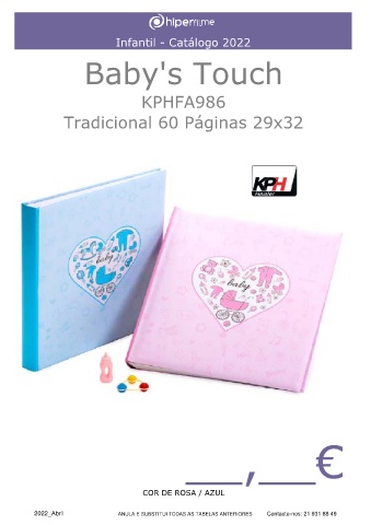 Infantil - Catálogo 2022 Baby's Touch KPHFA986 Tradicional 60 Páginas 29x32 __,__€ COR DE ROSA / AZUL 2022_Abril ANULA E SUBSTITUI TODAS AS TABELAS ANTERIORES Contacte-nos: 21 931 88 49