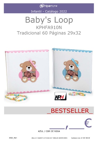 Infantil - Catálogo 2022 Baby's Loop KPHFA910N Tradicional 60 Páginas 29x32 _BESTSELLER_ __,__€ AZUL / COR DE ROSA 2022_Abril ANULA E SUBSTITUI TODAS AS TABELAS ANTERIORES Contacte-nos: 21 931 88 49
