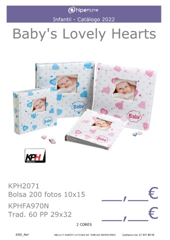 Infantil - Catálogo 2022 Baby's Lovely Hearts KPH2071 Bolsa 200 fotos 10x15 __,__€ KPHFA970N Trad. 60 PP 29x32 __,__€ 2 CORES 2022_Abril ANULA E SUBSTITUI TODAS AS TABELAS ANTERIORES Contacte-nos: 21 931 88 49