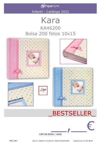Infantil - Catálogo 2022 Kara KA46200 Bolsa 200 fotos 10x15 _BESTSELLER_ __,__€ COR DE ROSA / AZUL 2022_Abril ANULA E SUBSTITUI TODAS AS TABELAS ANTERIORES Contacte-nos: 21 931 88 49