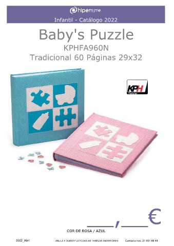 Infantil - Catálogo 2022 Baby's Puzzle KPHFA960N Tradicional 60 Páginas 29x32 __,__€ COR DE ROSA / AZUL 2022_Abril ANULA E SUBSTITUI TODAS AS TABELAS ANTERIORES Contacte-nos: 21 931 88 49