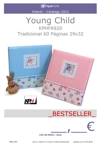 Infantil - Catálogo 2022 Young Child KPHFA920 Tradicional 60 Páginas 29x32 _BESTSELLER_ __,__€ COR DE ROSA / AZUL 2022_Abril ANULA E SUBSTITUI TODAS AS TABELAS ANTERIORES Contacte-nos: 21 931 88 49