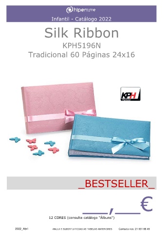 Infantil - Catálogo 2022 Silk Ribbon KPH5196N Tradicional 60 Páginas 24x16 _BESTSELLER_ __,__€ 12 CORES (consulte catálogo "Álbuns") 2022_Abril ANULA E SUBSTITUI TODAS AS TABELAS ANTERIORES Contacte-nos: 21 931 88 49
