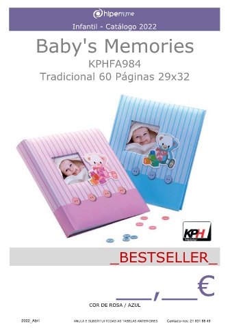 Infantil - Catálogo 2022 Baby's Memories KPHFA984 Tradicional 60 Páginas 29x32 _BESTSELLER_ __,__€ COR DE ROSA / AZUL 2022_Abril ANULA E SUBSTITUI TODAS AS TABELAS ANTERIORES Contacte-nos: 21 931 88 49
