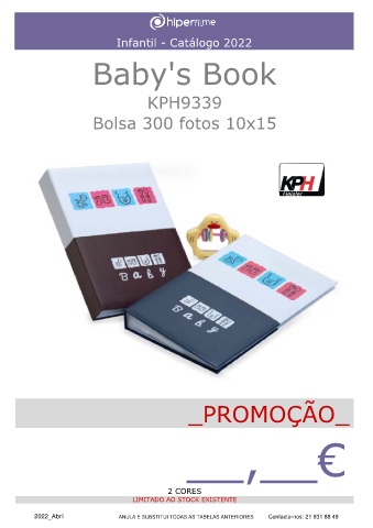 Infantil - Catálogo 2022 Baby's Book KPH9339 Bolsa 300 fotos 10x15 _PROMOÇÃO_ __,__€ 2 CORES LIMITADO AO STOCK EXISTENTE 2022_Abril ANULA E SUBSTITUI TODAS AS TABELAS ANTERIORES Contacte-nos: 21 931 88 49