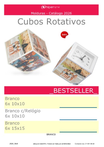 Molduras - Catálogo 2026 Lugo Cubos Rotativos _BESTSELLER_ Branco 6x 10x10 ______ Branco c/Relógio 6x 10x10 ______ Branco 6x 15x15 ______ BRANCO 2026_Abril ANULA E SUBSTITUI TODAS AS TABELAS ANTERIORES Contacte-nos: 21 931 88 49