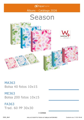 Álbuns - Catálogo 2026 Season MA363 Bolsa 40 fotos 10x15 ______ ME363 Bolsa 200 fotos 10x15 ______ FA363 Trad. 60 PP 30x30 ______ 3 CORES 2026_Abril ANULA E SUBSTITUI TODAS AS TABELAS ANTERIORES Contacte-nos: 21 931 88 49