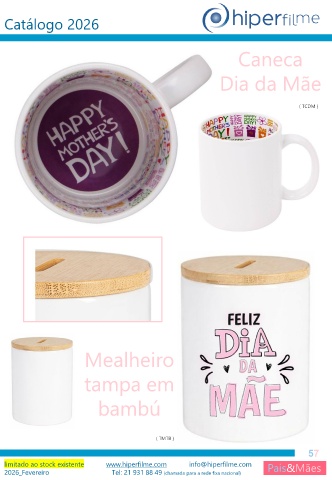 Catálogo 2026 Caneca Dia da Mãe ( TCDM ) Mealheiro tampa em bambú ( TMTB ) 57 limitado ao stock existente www.hiperfilme.com info@hiperfilme.com Pais&Mães 2026_Fevereiro Tel: 21 931 88 49 (chamada para a rede fixa nacional)