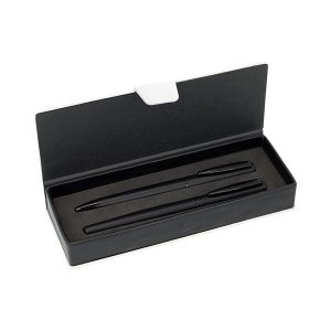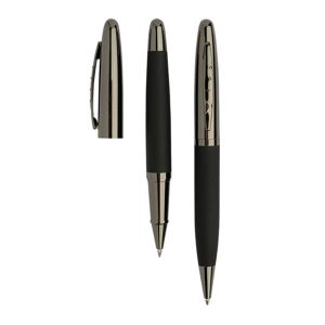Conjunto de esferográfica e roller em estojo de oferta para personalizar. Esferográfica e roller de corpo metálico e com toque de borracha.