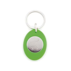 Porta-chaves CR-Z para personalizar, com formato oval e moeda para carrinho de compras. Inserção de papel em 1 face com tampa em acrílico.