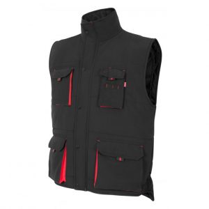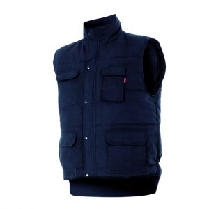 Colete com tecido exterior em 65% poliéster e 35% algodão tecido sarja 200 grs/m2. Acolchoado em 100% poliéster de 220 grs/m2.
