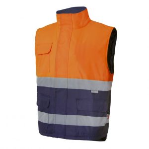 Colete acolchoado bicolor alta visibilidade para personalizar. Pala central com fecho de velcro. Forro polar no interior da gola.