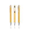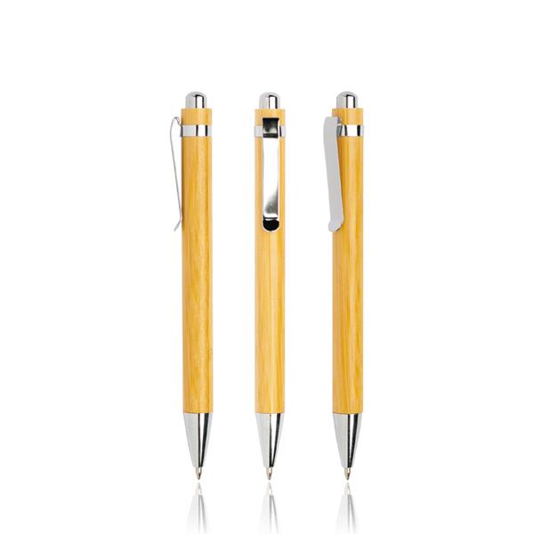 Esferográfica em bamboo com clip metálico. Escrita azul e sistema pulsar. Cor simples.