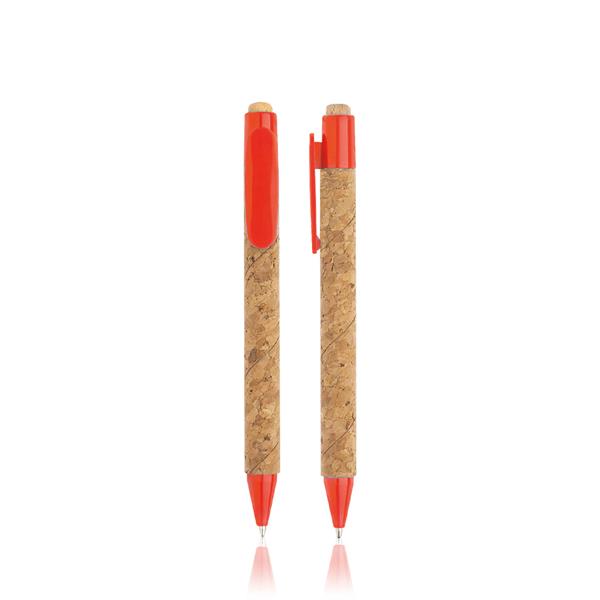 Esferográfica em cortiça. Esferográfica com tinta preta. Nos seus detalhes encontra a cor da ponta.