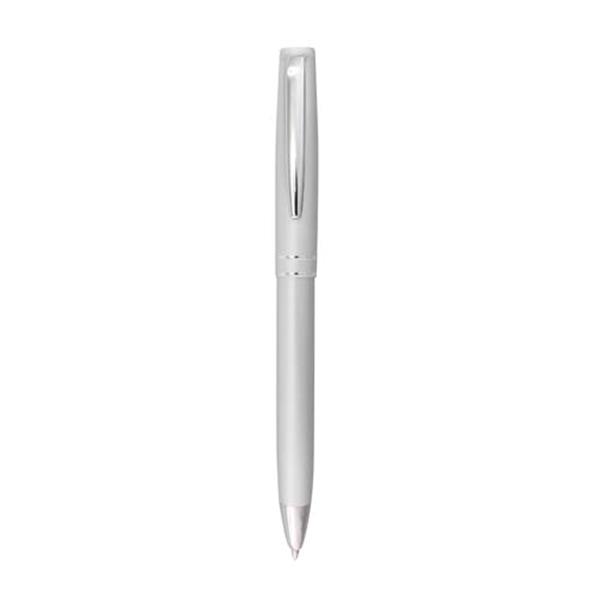 Esferográfica de plástico, detalhes cor cinza. Escrita azul, sistema pulsar. Disponível para personalização em várias cores.