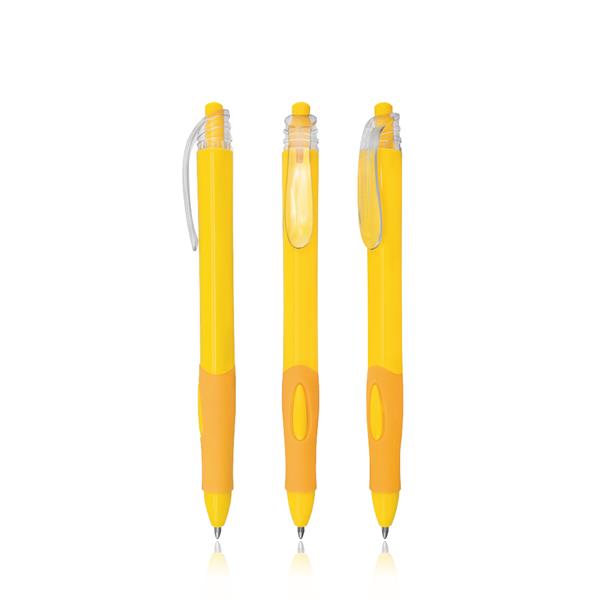 Esferográfica de mecanismo pulsador, disponível em diversas cores vivas e brilhantes. Ideal para personalizar. Tinta azul.