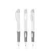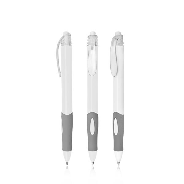Esferográfica de plástico, detalhes cor cinza. Escrita azul, sistema pulsar. Disponível para personalização em várias cores.
