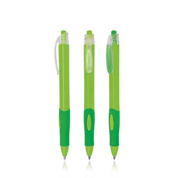 Esferográfica de plástico para personalização, Néon. Escrita preta, sistema pulsar. Cores vistosas e design simplista.