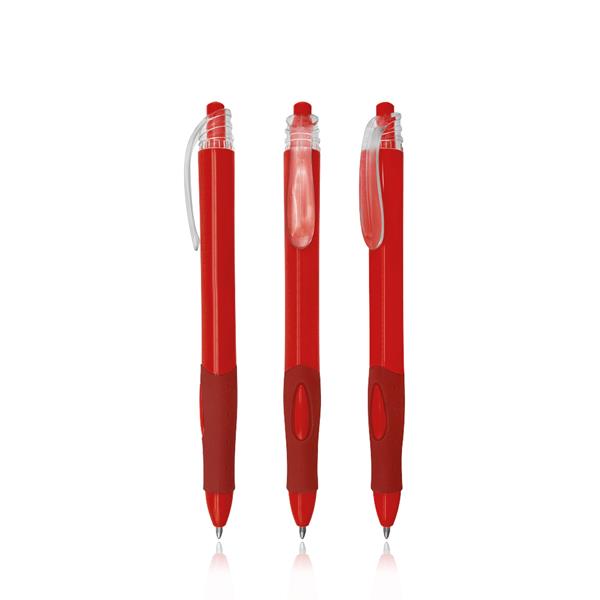 Esferográfica com pega e corpo coloridos e clip transparente para ser personalizada. Escrita preta. Esferográfica de plástico. Detalhes transparentes.
