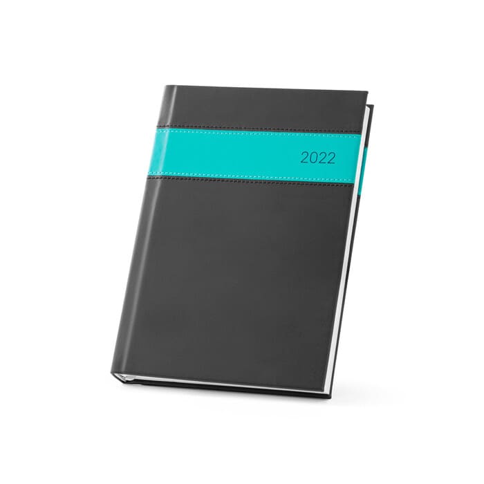Agenda A5 em imitação de pele com marcador em fita. Com um plano diário para as suas tarefas. Disponível em quatro cores.
