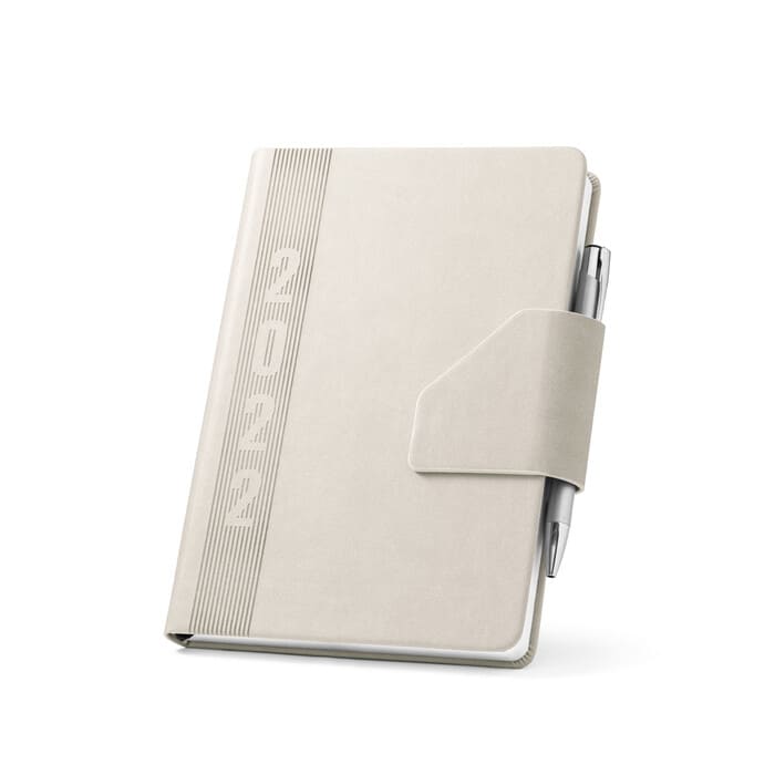 Bloco de notas original em PU com efeito madeira, com uma vasta gama de cores. De design ecológico, com capa de toque suave e fecho com elástico. Suporte para a caneta integrado. Com70 folhas pautadas, 25 post-its e 125 mini notas adesivas.