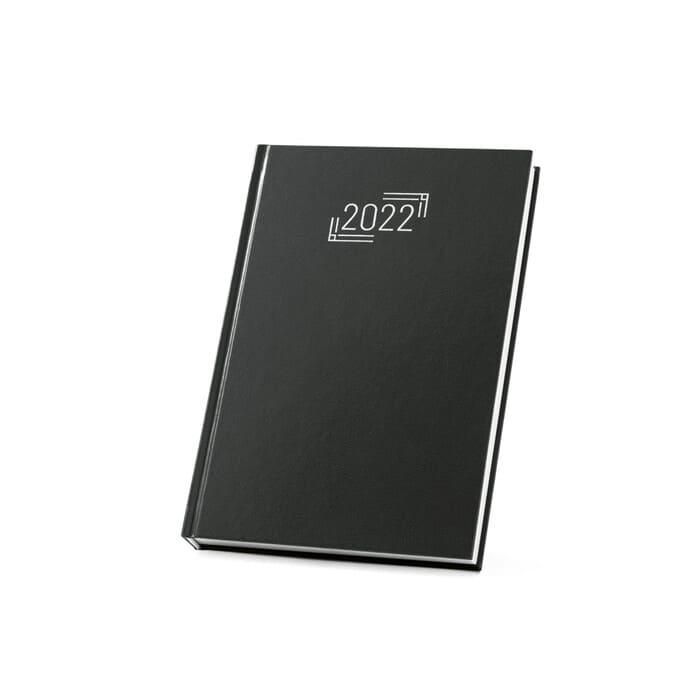 Agenda A5 com capa dura e marcador em fita. Com papel de cor branco. Disponível em três cores.
