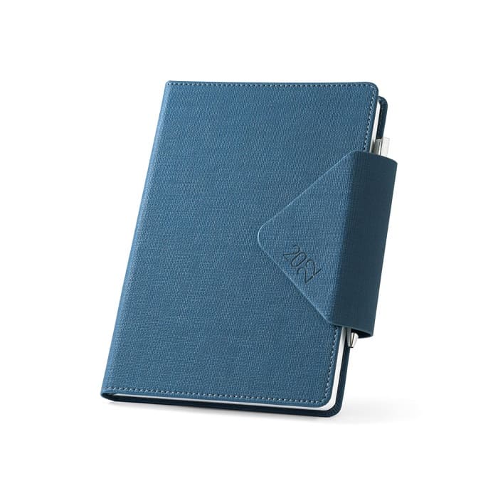 Agenda A5 em imitação de pele com fecho magnético. Com suporte para esferográfica. Fornecida com bolsa de non-woven e esferográfica incluída.