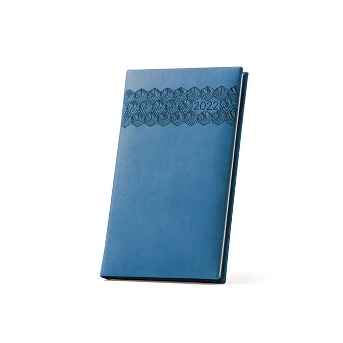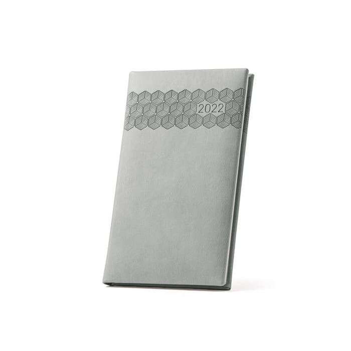 Agenda de bolso em imitação de pele com padrão impresso. Papel de cor branco. Disponível em quatro cores.
