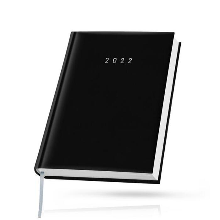Agenda diária A5, capa em Papel/PVC. Com 336 páginas, em papel branco 70g. e fitilho prateado. Idioma principal: Português e Espanhol.