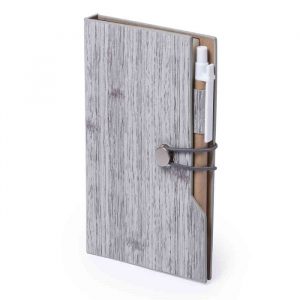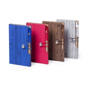 Bloco de notas original em PU com efeito madeira, com uma vasta gama de cores. De design ecológico, com capa de toque suave e fecho com elástico. Suporte para a caneta integrado. Com70 folhas pautadas, 25 post-its e 125 mini notas adesivas.