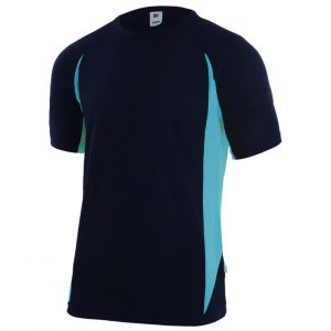 Gola redonda, faixa de tecido base que cobre a costura da gola e laterais em cor de contraste para personalizar.