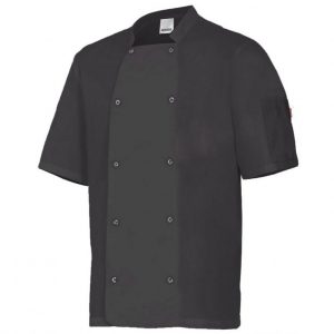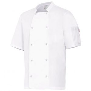 Fecho central com botões de pressão, manga estilo alfaiate de duas peças, costura de segurança nas costas e no escapulário para personalizar.