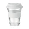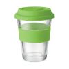 Copo de vidro com tampa e pega em silicone e uma capacidade 350 ml. Trata-se de uma caneca de parede única.