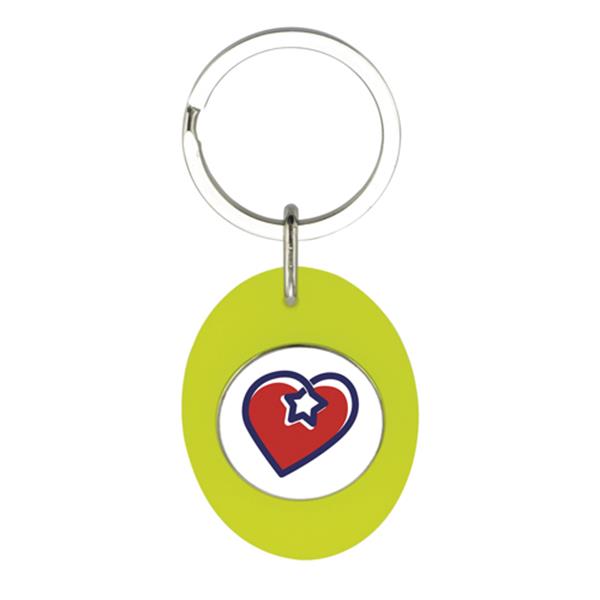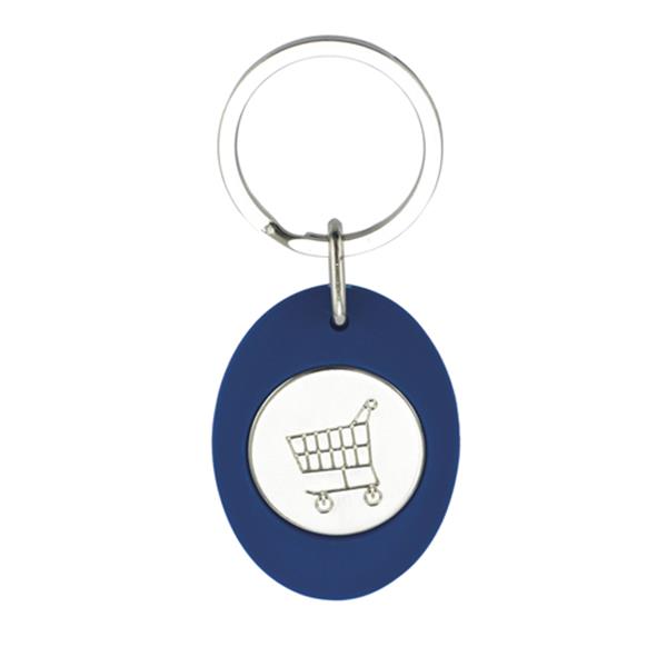Porta-chaves CR-Z para personalizar, com formato oval e moeda para carrinho de compras. Inserção de papel em 1 face com tampa em acrílico.