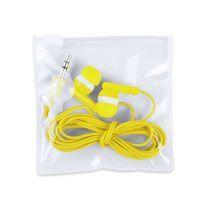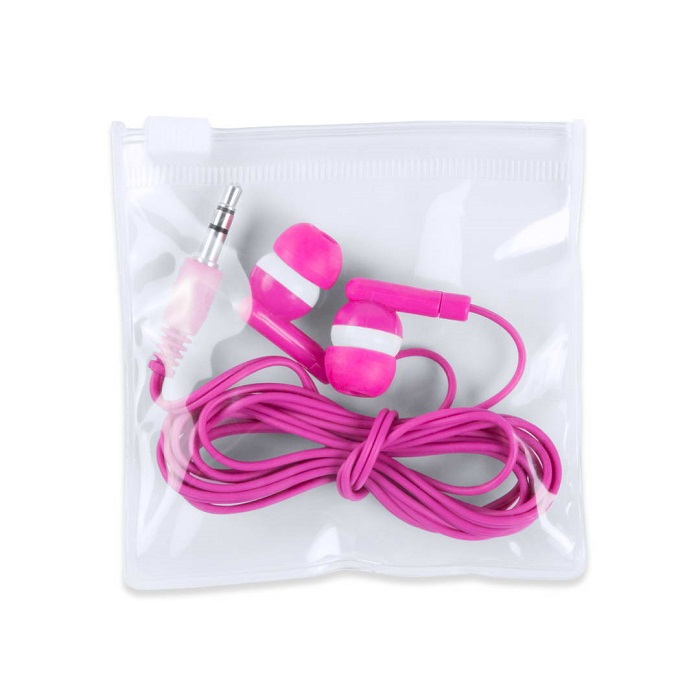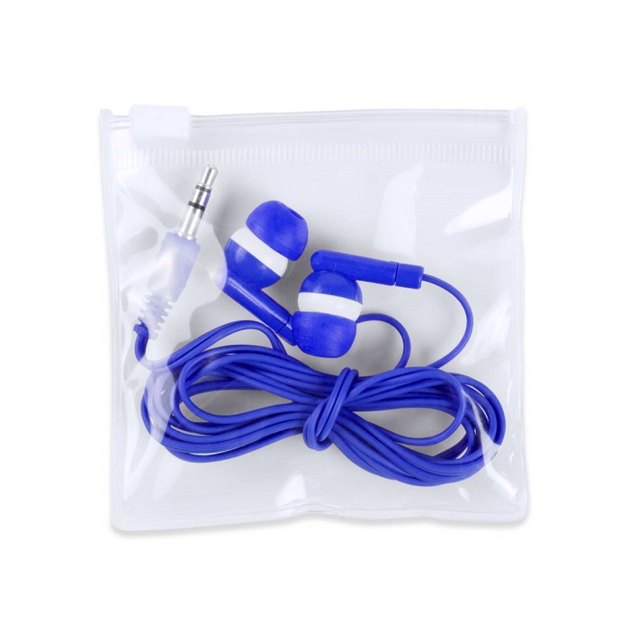 Fones intra-auriculares práticos e confortáveis, com um design de duas cores, conexão Jack de 3,5 mm. Apresentado em saco de PVC transparente com fecho automático.