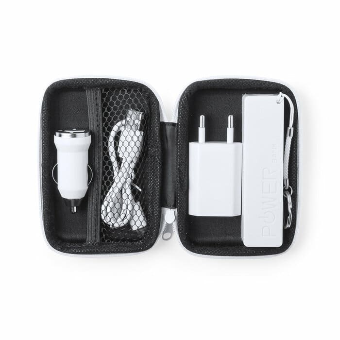 Set com Powerbank com potência de 2000 mAh e carregador USB 1000 mA. Cabo Incluído Conexão Micro USB, Tipo C e Lightning incluídos.