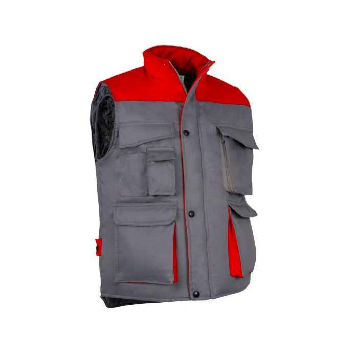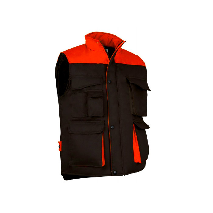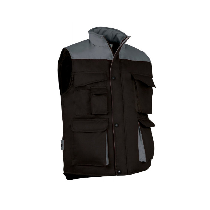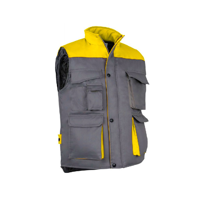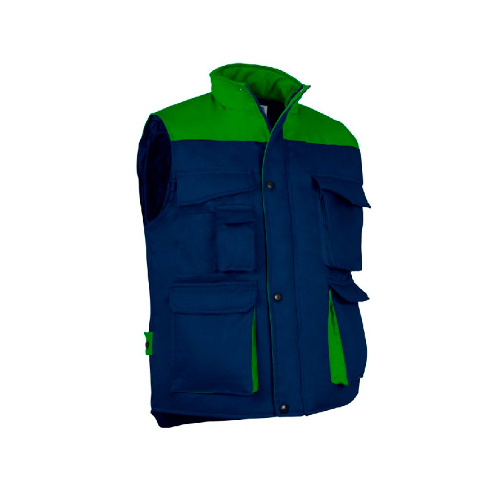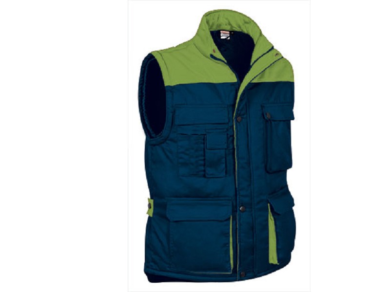 Colete com tecido exterior em 65% poliéster e 35% algodão tecido sarja 200 grs/m2. Acolchoado em 100% poliéster de 220 grs/m2.