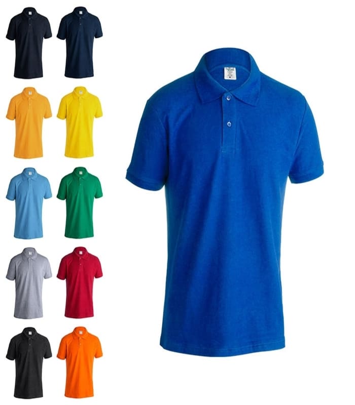 Polo de adulto disponível em diversas cores. Com dois botões na gola. Com ribe nas mangas. Costuras reforçadas.