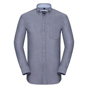 Costuras duplas na gola, mangas, ombros e cinta