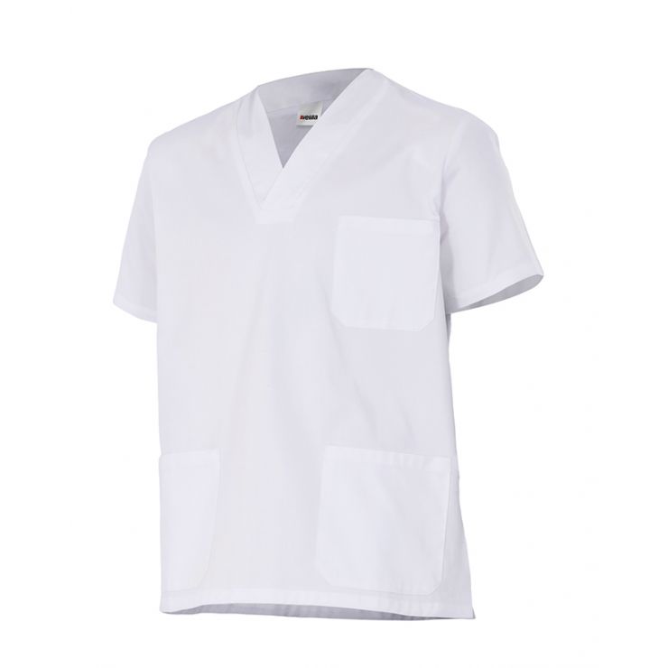 T-shirt de malha lisa com gola em V. É reforçada nos ombros e possuí dupla costura nas mangas e na bainha.
