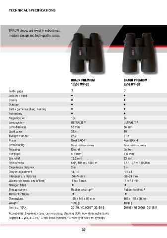 Legend: = yes, ° = no, = fold down eyecups, = twist-type snap-on eyecups