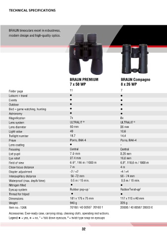 Legend: = yes, ° = no, = fold down eyecups, = twist-type snap-on eyecups